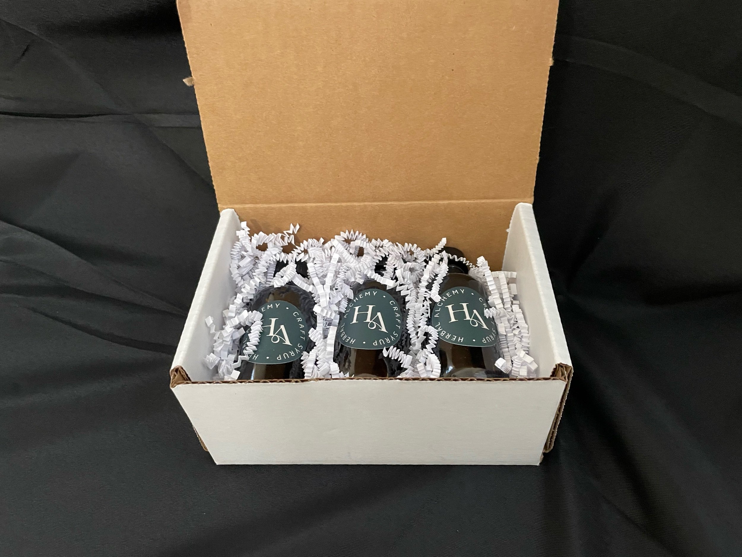 Three bottles of herbal craft syrup with different labels: Daybreak, Alchemist's Mead, and Noël, each with distinct flavors and packaging design.